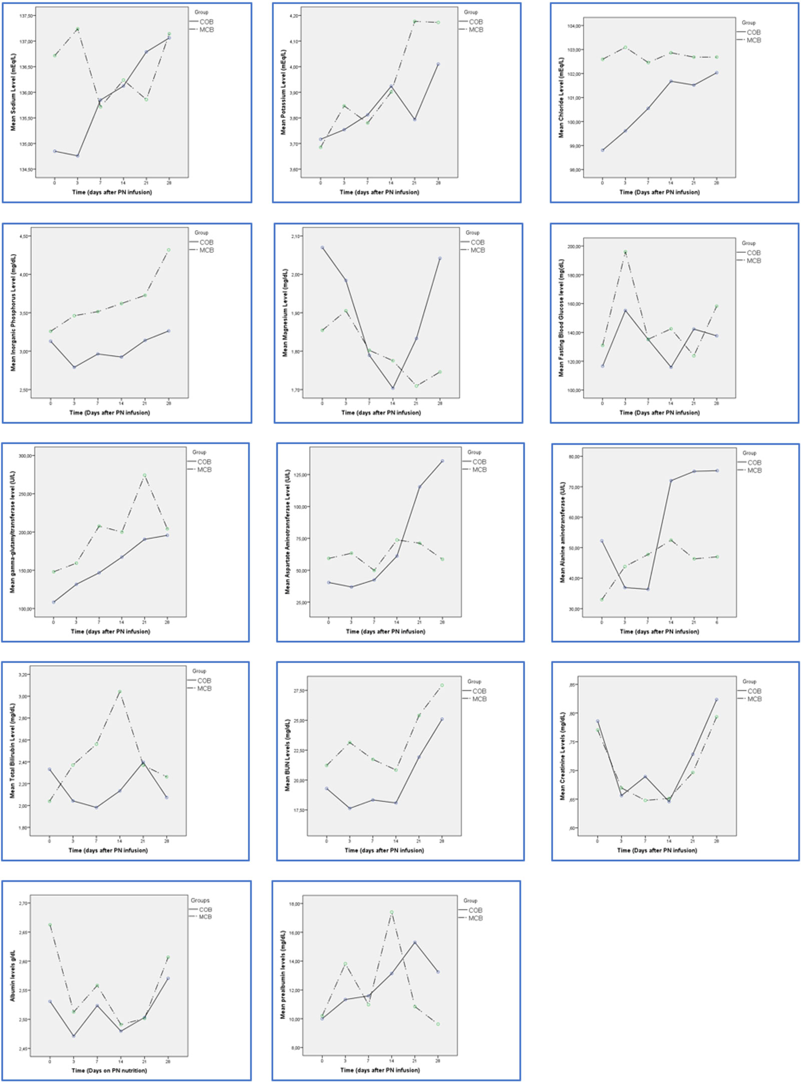 One of the other common complications of parenteral nutrition is LD, which is associated with a higher risk of mortality.20 However, the causes of hepatic and biliary abnormalities induced by continuous PN have not been identified yet20 even patients who receive PN for a short time frequently develop cholestasis.21 Hepatic parameters should be continuously monitored in patients receiving PN to prematurely detect and treat any potential liver dysfunction. For this reason, our protocol included third day and the weekly monitoring of hepatic parameters. In both COB and MCB groups liver function tests were similar and tended to elevate as time passes on PN.