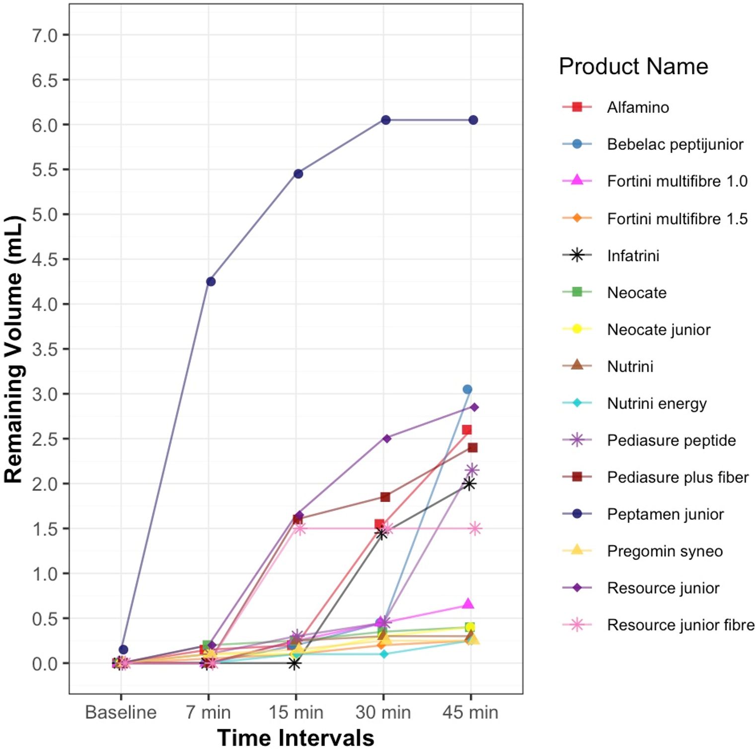 A total of fifteen infant and child formulas, including both powder-based and ready-to-feed liquid products, were included in the analysis. At baseline, all formulas (100%) were classified as thin (IDDSI level 0). Peptamen junior (liquid) consistently over-thickened to Level 2. Alfamino (powder) demonstrated stability, maintaining Level 1 after 15 minutes (Figure 1).