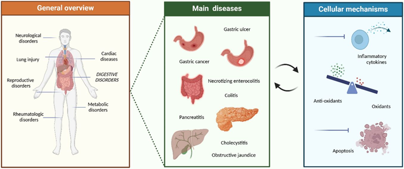 Recent studies have revealed that nesfatin-1 exerts a broader spectrum of biological effects than previously anticipated. Beyond its anorexigenic action, nesfatin-1 expression has been documented across multiple organ systems, implicating the peptide in diverse physiological and pathological conditions. As summarized in Figure 1, alterations in nesfatin-1 levels have been associated with a wide range of gastrointestinal and inflammatory disorders, including gastric ulcer, gastric cancer, colitis, necrotizing enterocolitis, pancreatitis, cholecystitis, and obstructive jaundice. At the cellular level, nesfatin-1 demonstrates cytoprotective properties, mediated through the inhibition of proinflammatory cytokine release, regulation of oxidative stress balance, and suppression of apoptosis. These mechanisms highlight nesfatin-1 as a potential therapeutic target for modulating inflammation, reducing tissue injury, and limiting disease progression.5
