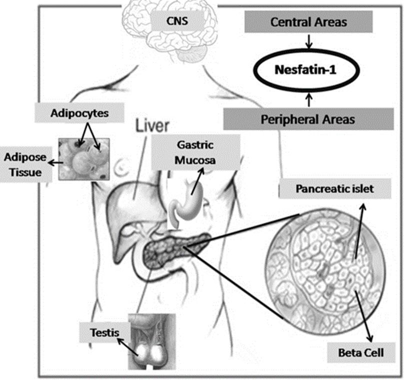 A multitude of studies have reported the secretion of nesfatin-1 by the central nervous system (CNS) as well as by peripheral tissues, including but not limited to adipose tissue, gastric mucosa, endocrine pancreatic beta cells, and testes.4 The level of this substance in the gastric oxyntic mucosa was found to be 20 times higher than in the brain (Figure 2).8